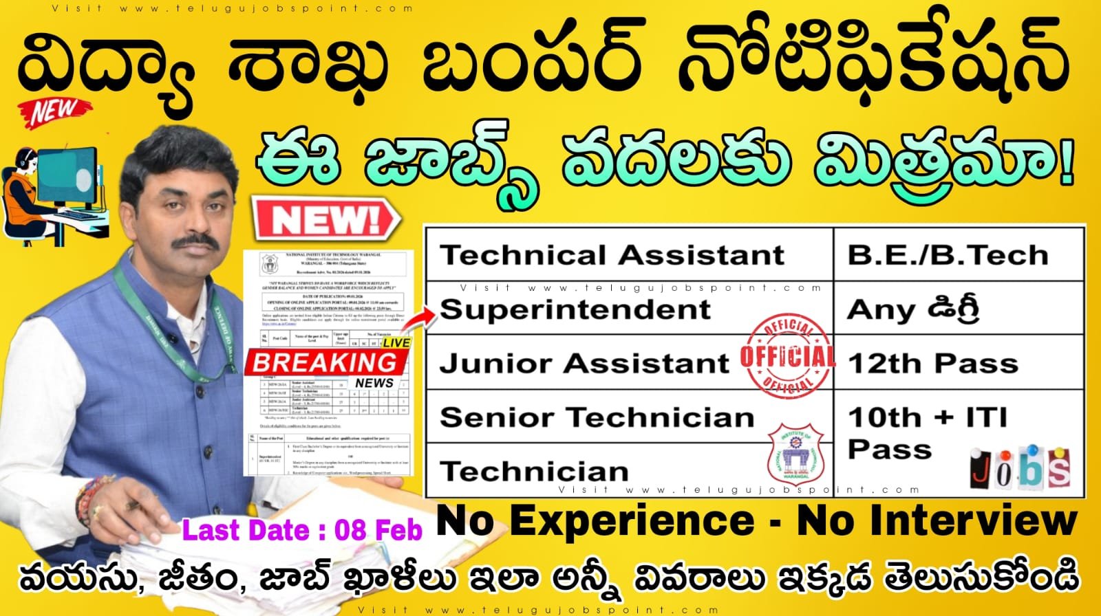 Latest NITW Recruitment 2026 Latest Technical Assistant & Junior Assistant Job Notification 2026 Apply Now: ప్రెండ్స్ ఈరోజు మీకోసం ఒక భారీ గవర్నమెంట్ జాబ్ నోటిఫికషన్లు మీ ముందుకు తీసుకురావడం జరిగింది మీరు 12th, ITI, Any డిగ్రీ, డిప్లొమా, B.E/ B.Tech/MCA పాస్ అయివుంటే..నేషనల్ ఇన్స్టిట్యూట్ ఆఫ్ టెక్నాలజీ వరంగల్ (NITW) లో డైరెక్ట్ రిక్రూట్మెంట్ ప్రాతిపదికన సూపరింటెండెంట్, టెక్నికల్ అసిస్టెంట్, సీనియర్ టెక్నీషియన్, జూనియర్ అసిస్టెంట్ & టెక్నీషియన్ పోస్టులను భర్తీ చేయడానికి అర్హులైన భారతీయ పౌరుల నుండి ఆన్లైన్ దరఖాస్తులను ఆహ్వానిస్తున్నాము. అర్హతగల అభ్యర్థులు https://nitw.ac.in/Careers/ ద్వారా ముగింపు తేదీ 08.02.2026 23.59 గంటలు లోపు దరఖాస్తు చేసుకోవచ్చు.