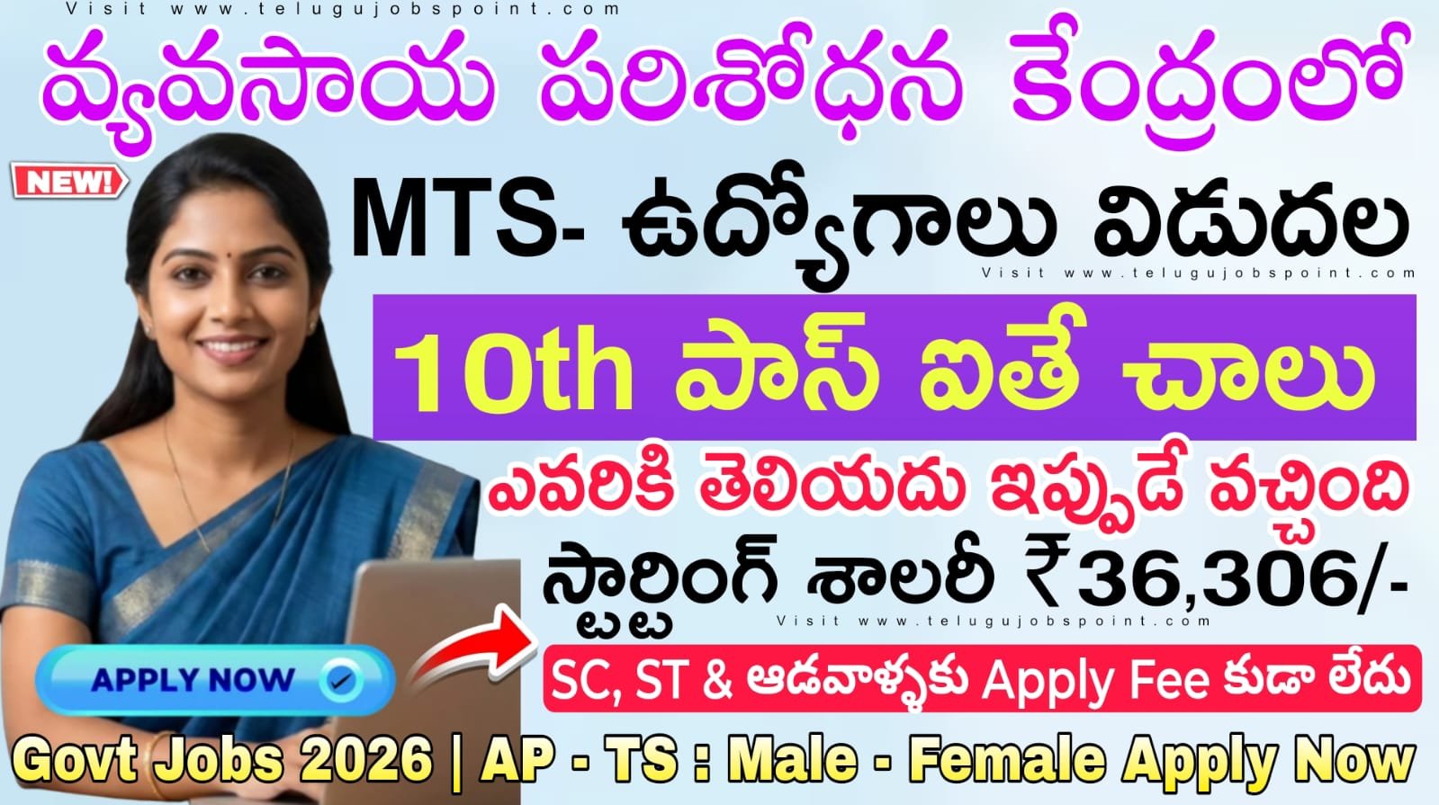 CSIR-సెంట్రల్ సైంటిఫిక్ ఇన్స్ట్రుమెంట్స్ ఆర్గనైజేషన్ (CSIR-CSIO) లో మల్టీ- టాస్కింగ్ స్టాఫ్ (MTS) ఉద్యోగుల కోసం నోటిఫికేషన్ విడుదల చేశారు. మెట్రిక్యులేషన్ లేదా ఇంటర్మీడియట్ (12వ తరగతి) ఉత్తీర్ణత కలిగిన అభ్యర్థులు అప్లై చేసుకోవచ్చు. నెలకు మొత్తం జీతాలు (సుమారుగా) ₹36,306/- ఇస్తారు. గరిష్ట వయోపరిమితి 25 సంవత్సరాలు లోపు ఉడాలి. ఈ ఉద్యోగాలు కేంద్ర ప్రభుత్వ పర్మనెంట్ ఉద్యోగాలు.. రెండు తెలుగు రాష్ట్ర అభ్యర్థులు వెంటనే అప్లై చేసుకోండి. ఆన్లైన్ దరఖాస్తుల ప్రారంభ తేదీ 09.01.2026 నుంచి ఆన్లైన్ దరఖాస్తు మా వెబ్సైట్ www.csio.res.in లో ఇక్కడ పేర్కొన్న చివరి తేదీ 09.02.2026 సాయంత్రం 05.00 గంటల వరకు అందుబాటులో ఉంటుంది.