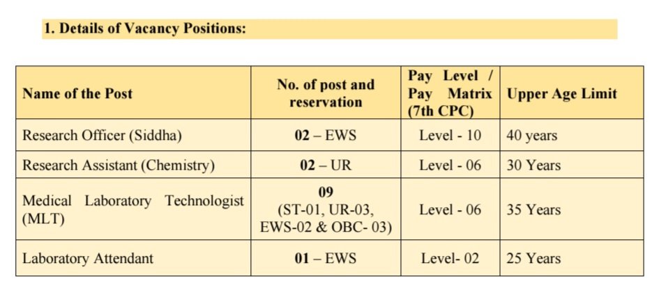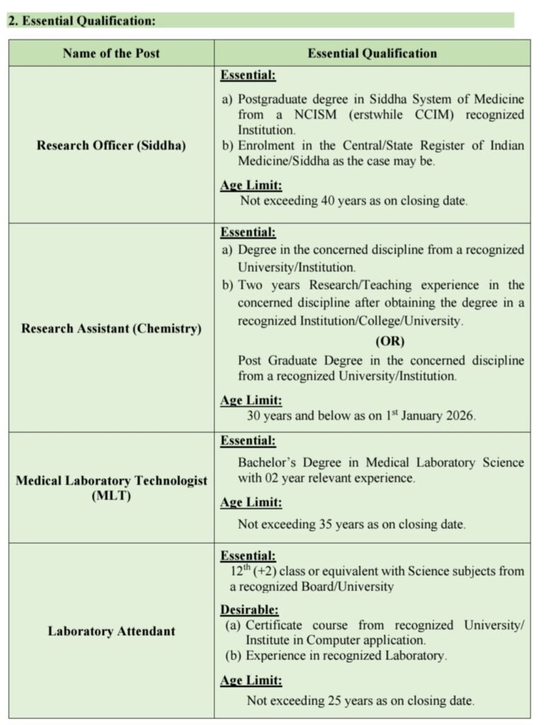 •రీసెర్చ్ ఆఫీసర్ :: NCISM (గతంలోని CCIM) గుర్తింపు పొందిన సంస్థ నుండి సిద్ధ వైద్య విధానంలో పోస్ట్ గ్రాడ్యుయేట్ డిగ్రీ. సందర్భాన్ని బట్టి సెంట్రల్/స్టేట్ రిజిస్టర్ ఆఫ్ ఇండియన్ మెడిసిన్/సిద్ధలో నమోదు.