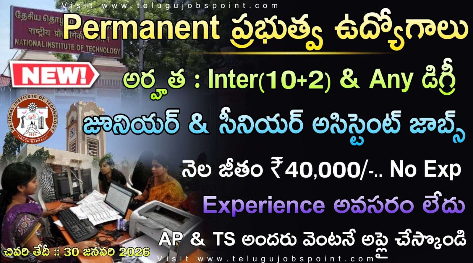 నిరుద్యోగులకు భారీ శుభవార్త.. కేవలం ఇంటర్మీడియట్ లేదా ఏదైనా డిగ్రీ పాసైన అభ్యర్థులకు.. తిరుచిరాపల్లిలోని నేషనల్ ఇన్స్టిట్యూట్ ఆఫ్ టెక్నాలజీలో సూపరింటెండెంట్, జూనియర్ అసిస్టెంట్ మరియు సీనియర్ అసిస్టెంట్ పోస్టులకు నియామకం కోసం అద్భుతమైన విద్యా రికార్డు మరియు సంబంధిత పని అనుభవం ఉన్న భారతీయ పౌరుల నుండి ఆన్లైన్ దరఖాస్తులను ఆహ్వానిస్తున్నారు. వయసు 18 సంవత్సరాల నుంచి 33 సంవత్సరాల మధ్యలో ఉండాలి. ఈ నోటిఫికేషన్ లో సెలెక్ట్ అయితే నెల రూ.₹25,500/-to ₹1,12,400/- జీతం ఇస్తారు. ఆన్లైన్ దరఖాస్తు, విద్యా అర్హతలు, అనుభవం, ఇతర అవసరాలు మరియు నిబంధనలు & షరతులకు సంబంధించిన వివరాల కోసం, దయచేసి ఇన్స్టిట్యూట్ వెబ్సైట్ http://www.nitt.edu ని సందర్శించండి. ఆసక్తిగల వ్యక్తులు ఇన్స్టిట్యూట్ వెబ్సైట్లో అందుబాటులో ఉన్న నిర్ణీత దరఖాస్తు ఫారమ్లో ఆన్లైన్లో దరఖాస్తు చేసుకోవచ్చు. ఆన్లైన్ దరఖాస్తును సమర్పించడానికి చివరి తేదీ 30.01.2026.