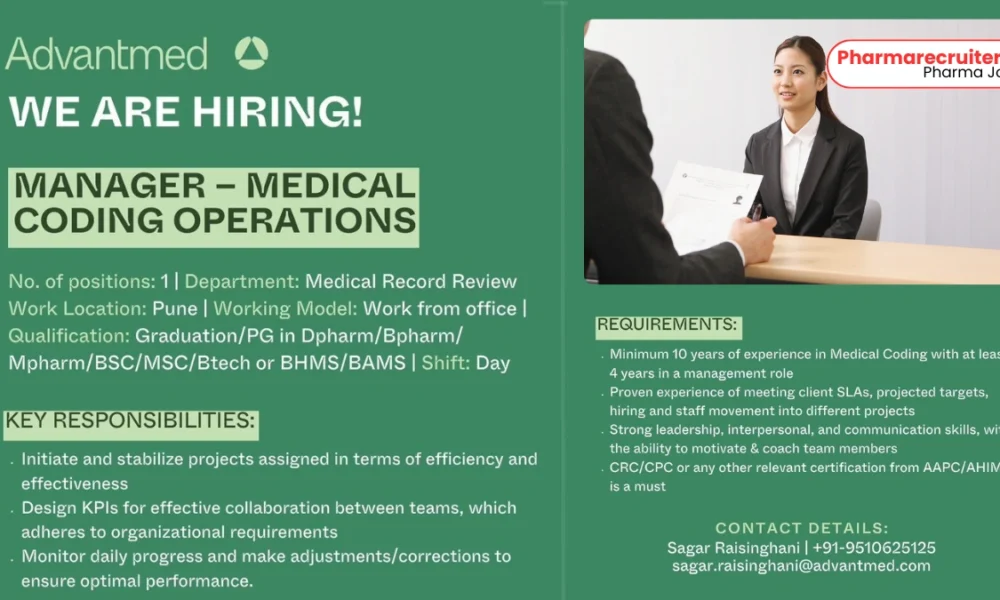 Advantmed is hiring an experienced Manager for Medical Coding Operations in Pune. Requires 10+ years in medical coding, management experience, and CPC/CRC certification. Day shift, work...