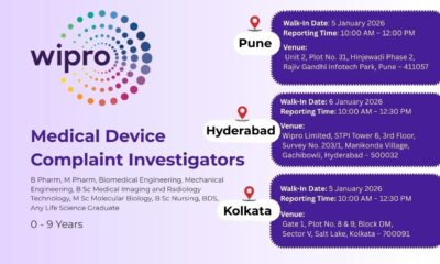 Wipro Limited is conducting multiple walk-in interview drives for the role of Medical Device Complaint Investigator across Kolkata, Hyderabad, and Pune. This is an excellent opportunity...