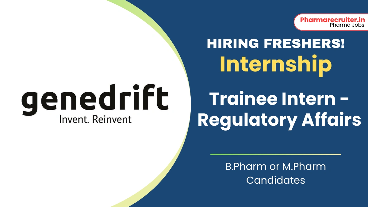 Fresher pharma jobs alert! Genedrift is hiring Regulatory Affairs Trainee Interns (WFH). Ideal for B.Pharm/M.Pharm freshers aged 18-24. Hands-on regulatory experience in a leading consultancy.