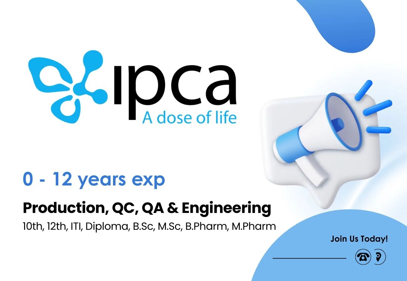 Are you ready to advance your career in the pharmaceutical industry? Ipca Laboratories Limited, a leading name in formulation manufacturing (OSD plant), is conducting a walk-in interview drive for multiple positions in Production, Packing, Quality Control (QC), Quality Assurance (QA), and Engineering departments.