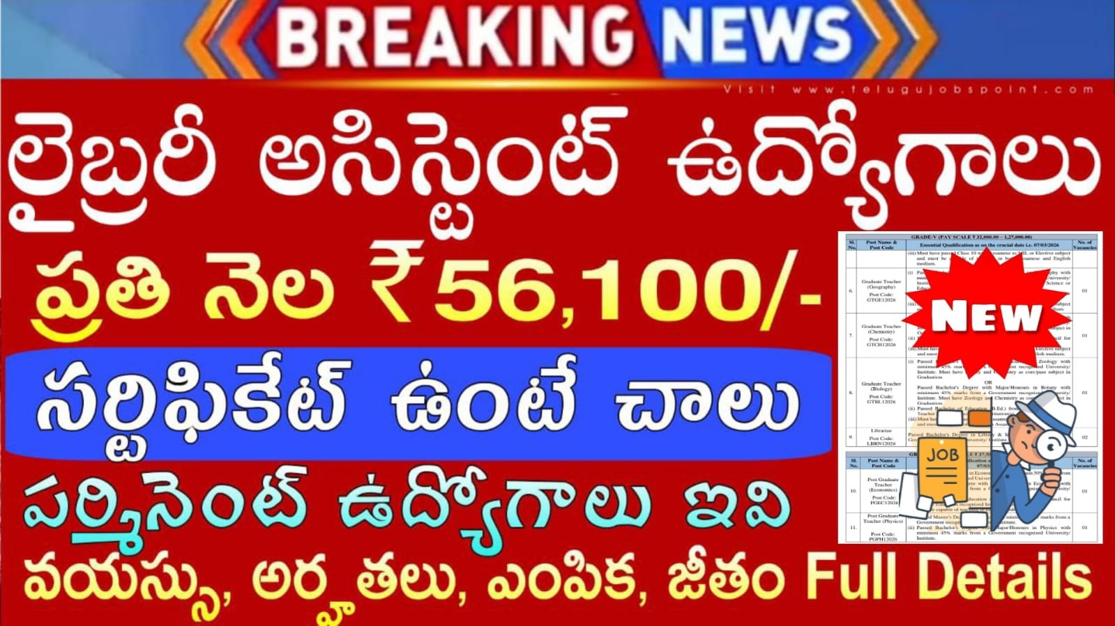 •లైబ్రేరియన్ :: ప్రభుత్వ గుర్తింపు పొందిన విశ్వవిద్యాలయం/సంస్థ నుండి లైబ్రరీ & ఇన్ఫర్మేషన్ సైన్స్లో బ్యాచిలర్ డిగ్రీ ఉత్తీర్ణత.