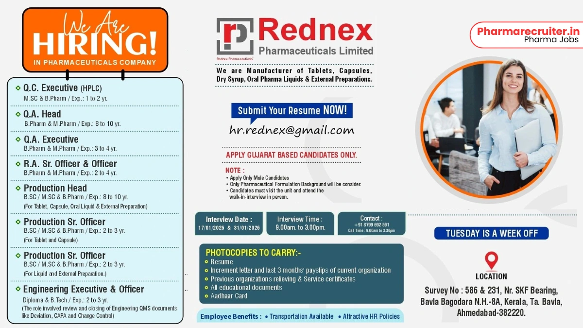 Exciting pharma jobs in Ahmedabad! Rednex Pharmaceuticals Limited is hiring experienced professionals for QA, QC, Production, RA & Engineering roles. Walk-in interviews on 17th & 31st January 2026. Gujarat-based male candidates only.